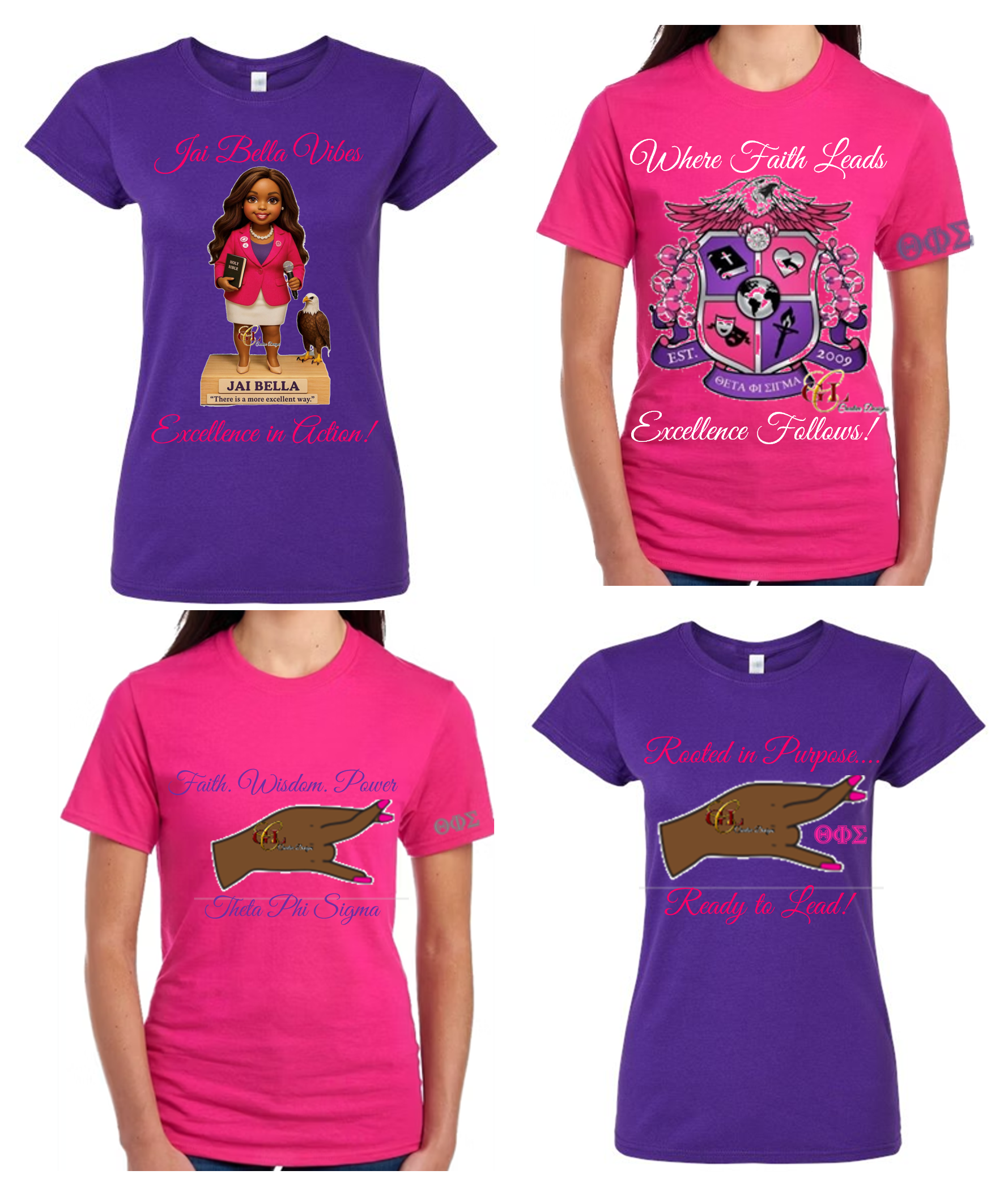 | Design | Theta Hand Sign and TODAH, Theta Hand Sign and Greek Letters, Theta Phi Sigma EST 2009 with Hand Sign, Theta Phi Sigma EST 2009 WITHOUT Hand Sign, (Backwards) We Stroll Together, (Regular) We Stroll Together, There is Strength in Sisterhood, I Understood the Assignment, Note to Self, Standing Strong, Self Love, Respect, Worth, Confidence, Assignment Accepted, A Theta Lady Nutritional Facts – 10 Pink Nuggets, A Theta Lady Nutritional Facts – 1 Sisterhood, Faith. Wisdom. Power, Jai Bella Design, Rooted in Purpose. Ready to Lead., Where Faith Leads. Excellence Follows With Insignia |